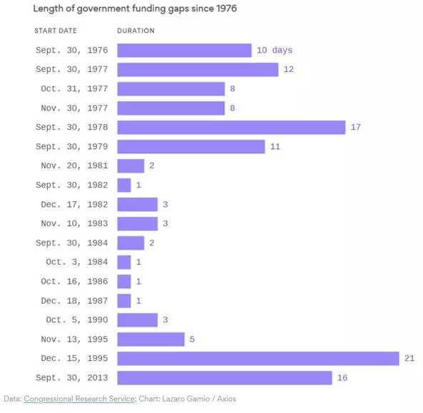 美國聯(lián)邦政府機(jī)構(gòu)因預(yù)算問題被迫關(guān)門曾出現(xiàn)多次。據(jù)統(tǒng)計,自1977年以來,聯(lián)邦政府部門部分關(guān)閉10次以上,時間短至1天,長至數(shù)周。最近一次是在2013年10月,當(dāng)時除了國家安全等基本職能,其余機(jī)構(gòu)進(jìn)入關(guān)門,約80萬雇員被迫進(jìn)入休假狀態(tài),130萬雇員進(jìn)入無薪工作狀態(tài)。