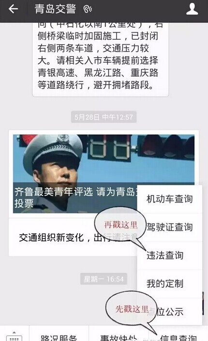 微信關(guān)注“青島交警”后,通過微信可以查交通違法及照片、可以查時時交通路況,微信綁定駕駛證和機動車信息后,可實時收到微信推送的機動車違法及駕駛證審驗等信息,方便廣大交通參與者。